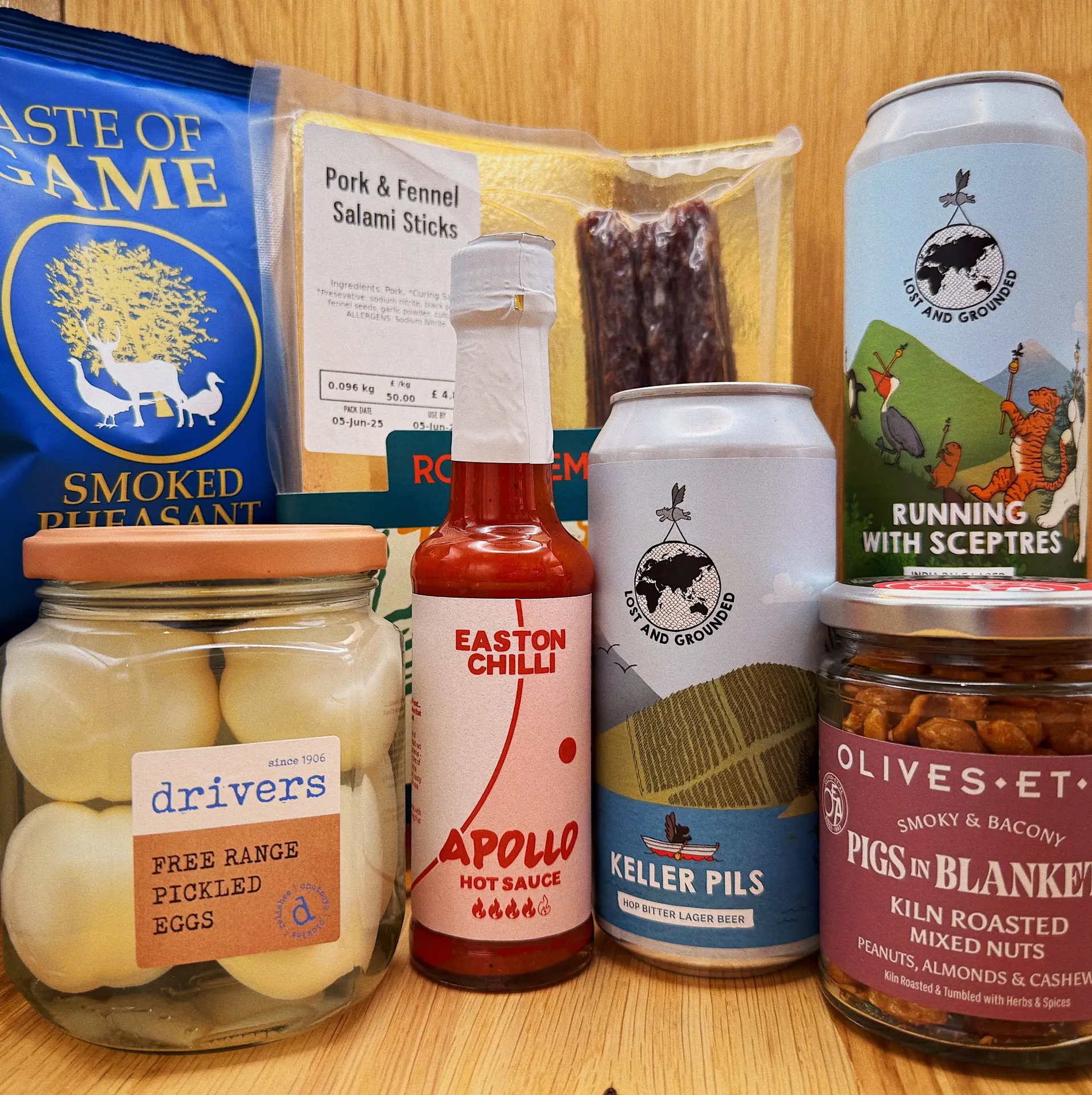 A relaxed selection for those who appreciate good beer and bold, savoury flavours. This hamper features two standout brews from Bristol’s Lost & Grounded: the crisp, unfiltered Keller Pils and the full-bodied Running with Sceptres Pale Ale.