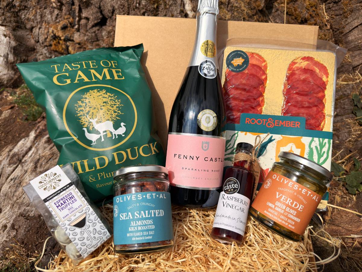The Celebration Hamper is a beautifully balanced collection of savoury bites, indulgent sweets and celebratory sparkle. At its centre: a bottle of Fenny Castle Sparkling Rosé – crisp, aromatic and distinctly English.