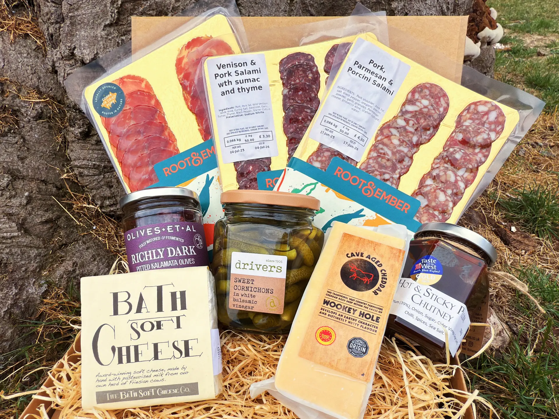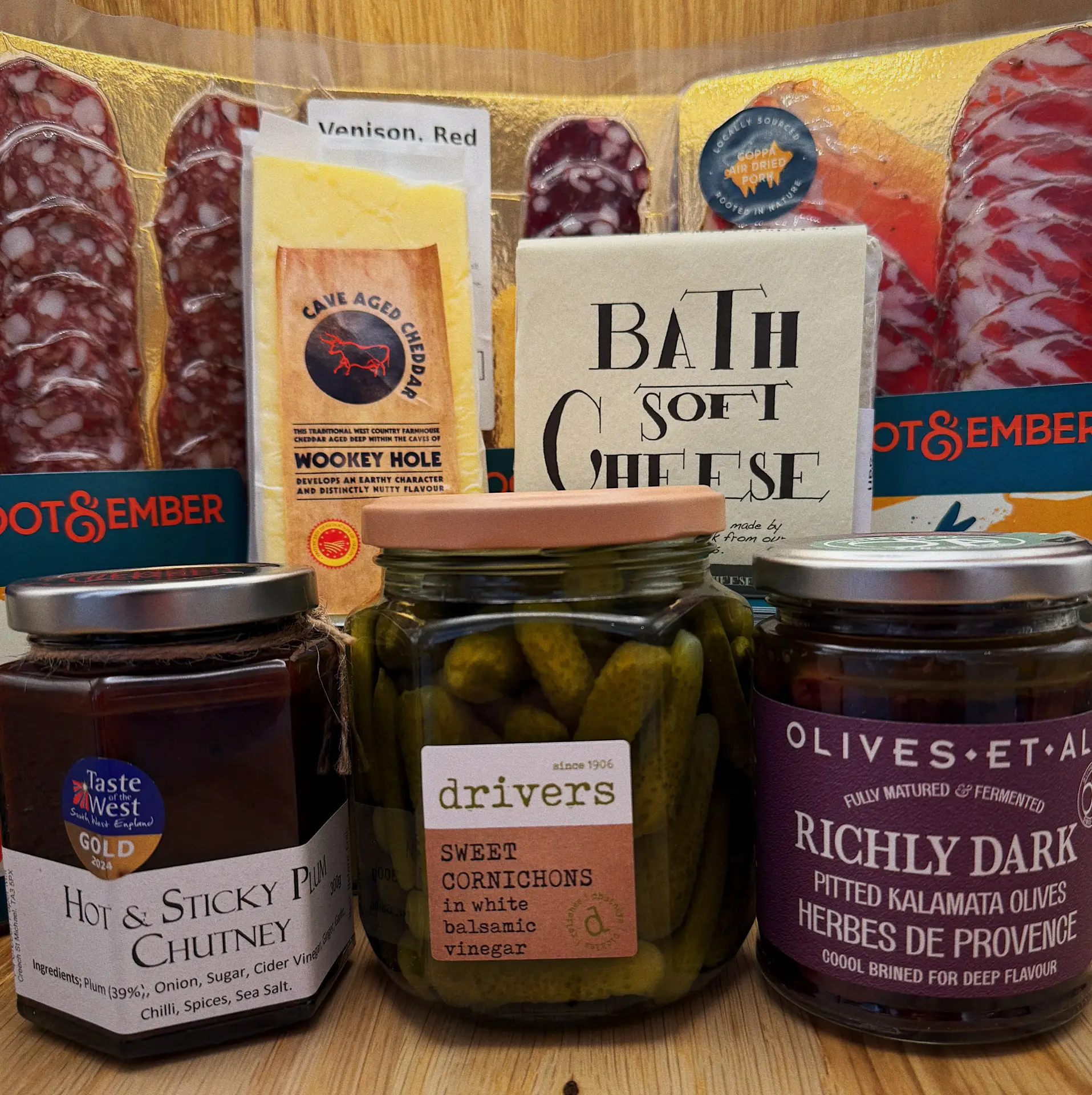Alongside, you’ll find robust Wookey Hole Cheddar and the creamy softness of Bath Soft Cheese, two exceptional West Country classics. Drivers Cornichons and Kalamata Olives from Olives et Al bring bite and brine, while The Chillees’ Hot & Sticky Plum Chutney adds a warming, gently spiced finish.
